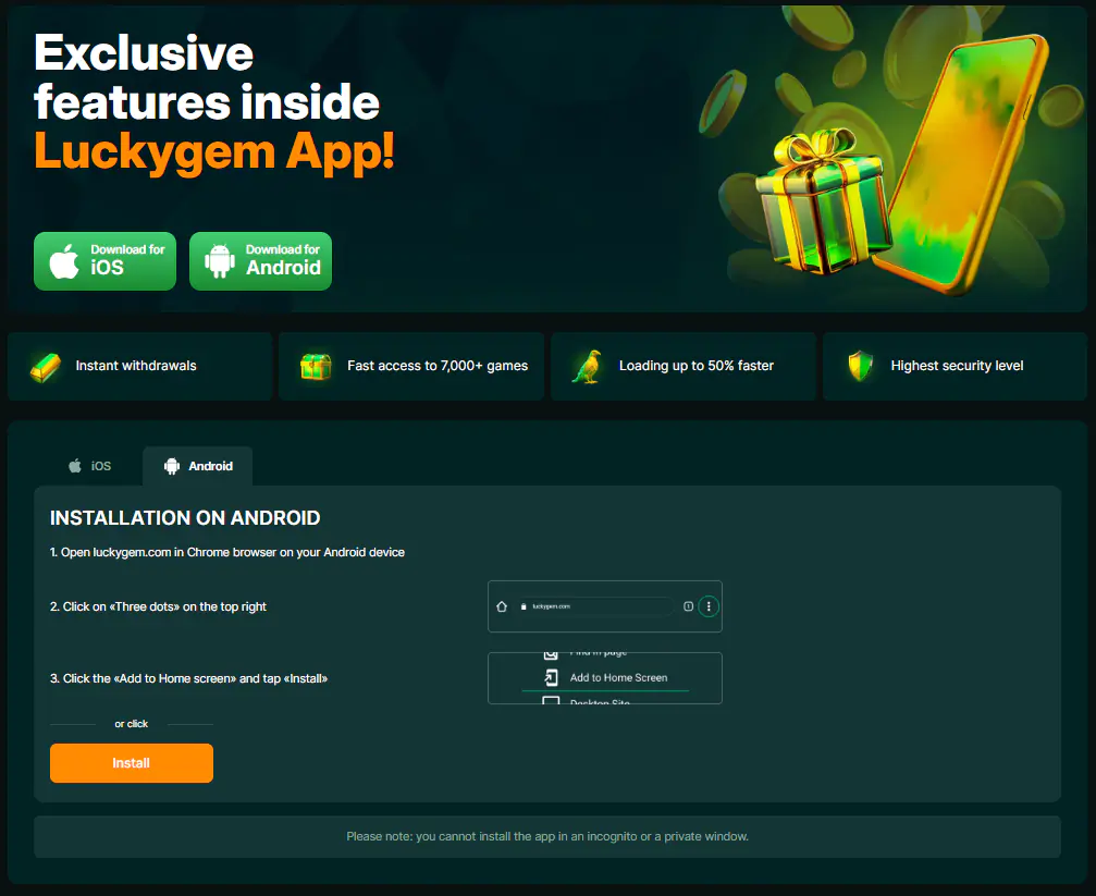 Het installeren van een APK-bestand is niet nodig en wordt om veiligheidsredenen afgeraden. De onderstaande methode is de enige officiële en beveiligde manier om toegang te krijgen tot de Lucky Gem casino app op Android.
