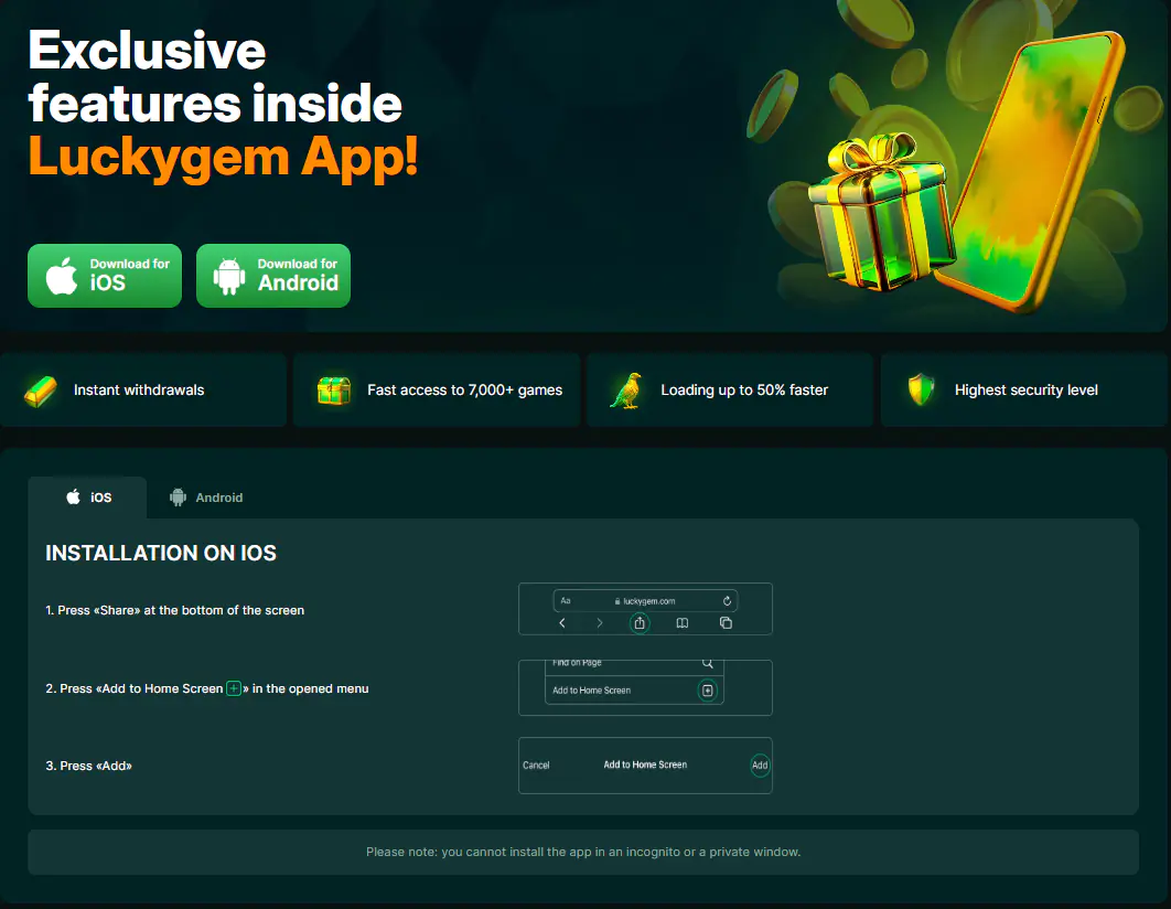 Door een Lucky Gem downloaden snelkoppeling toe te voegen, verschijnt het officiële Lucky Gem logo als icoon op je beginscherm. Met één tik heb je toegang tot het volledige mobiele casino, inclusief bonussen, spellen en klantenservice.